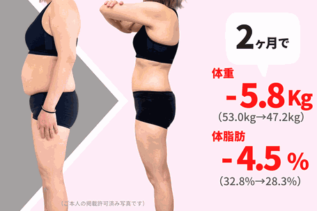 平均的には初月で−3kg前後、2ヶ月で−6〜8kgが多い結果です。