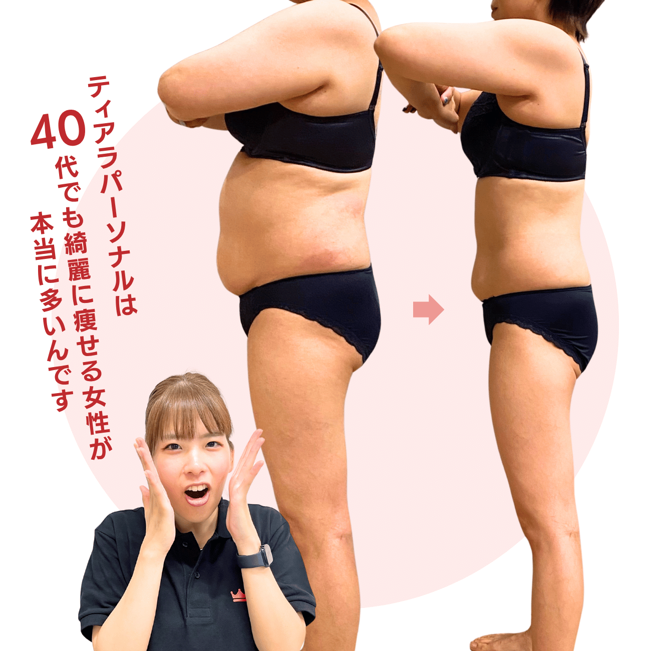 ティアラのダイエットプログラムは、ただ痩せるだけでは終わりません。食事・運動・姿勢・メンタルまでをトータルで見直し、リバウンドしない「一生ものの身体づくり」を目指した内容です。