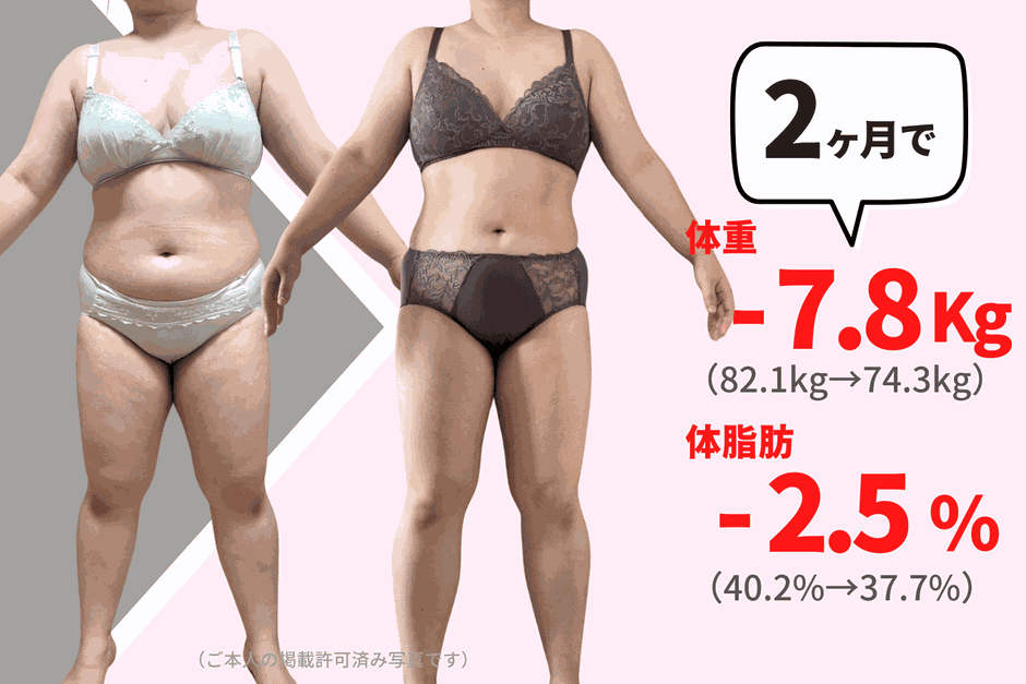2ヶ月で-7.8kgのダイエット、素晴らしい結果です!2ヶ月通して楽しみながら取り組まれたMさん、これからも新しい目標に向かって前進しましょう。スタッフ一同、引き続きサポート致します。